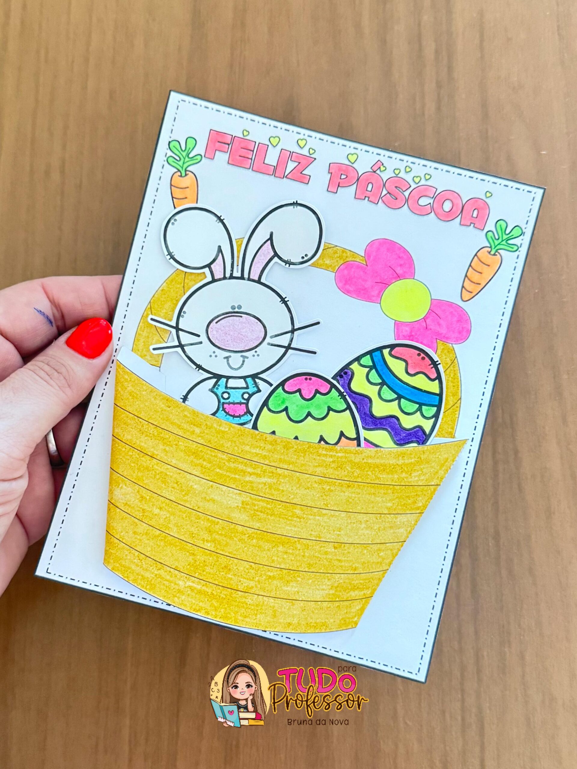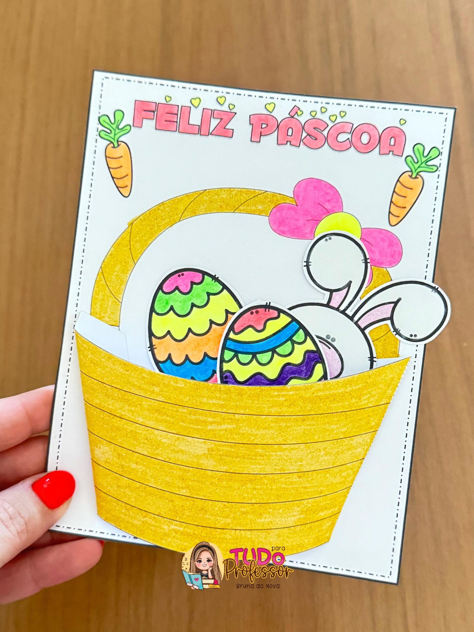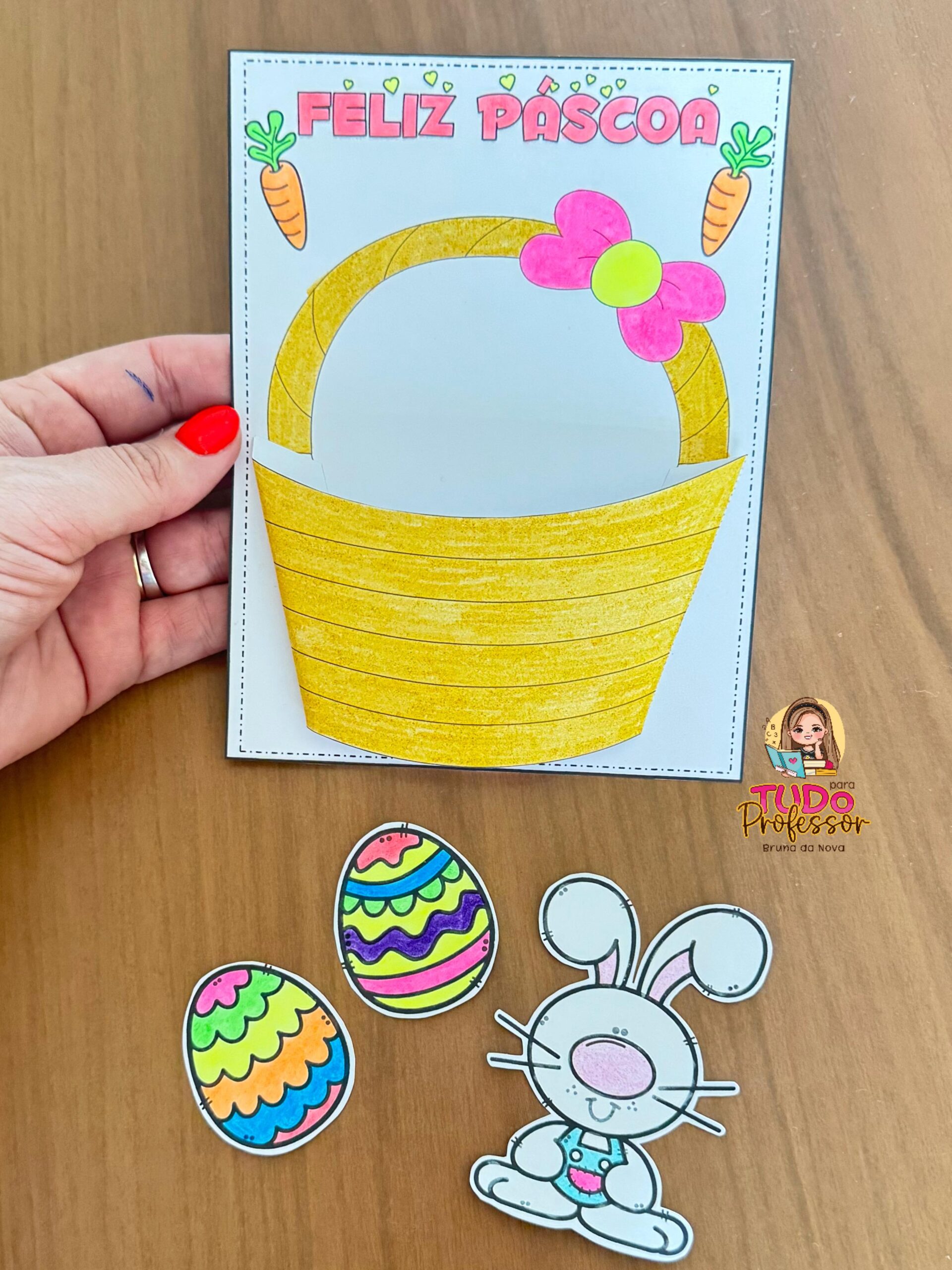 O material é composto pela arte do cartão interativo. Parte da frente da cesta, coelho e ovinhos para recortar e colar. Cartão medindo 17,5 cm X 13,5cm Utiliza-se uma folha para a confecção do cartão. MATERIAL EM PRETO E BRANCO