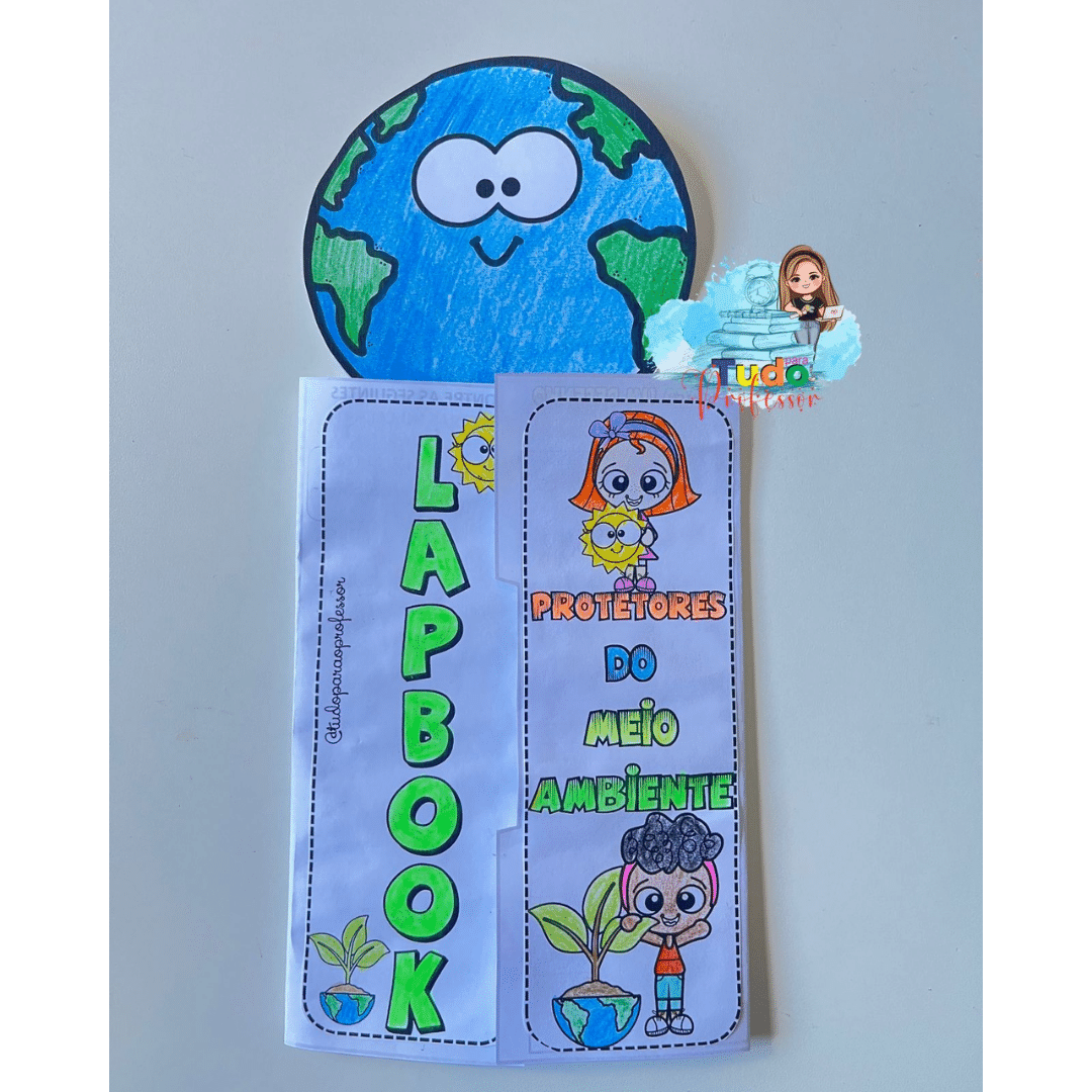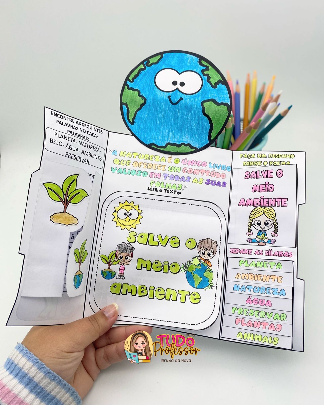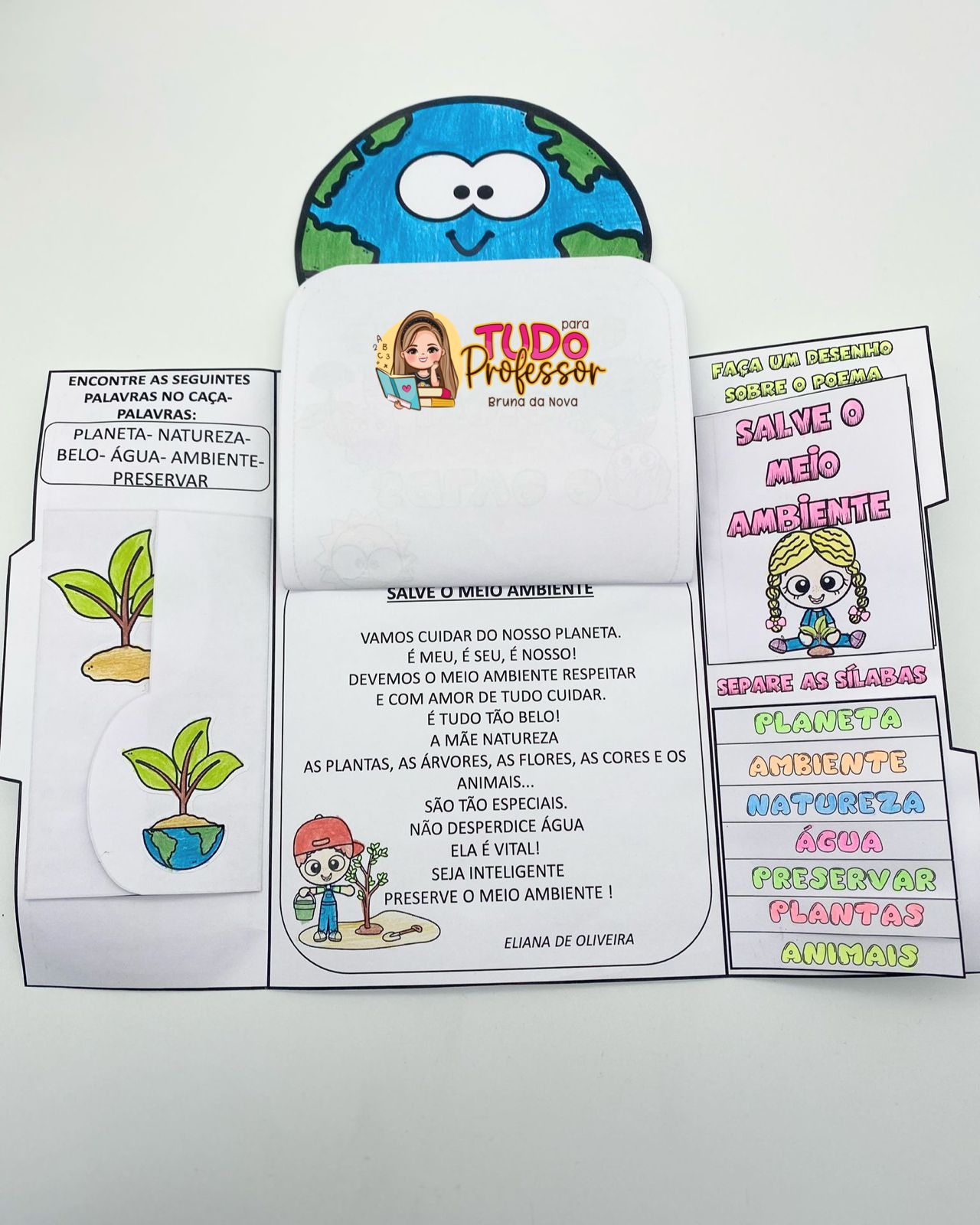 Material em preto e branco pronto para colorir e montar. Contém texto, caça palavras, material para colorir, separação silábica, desenho, conscientização ambiental.