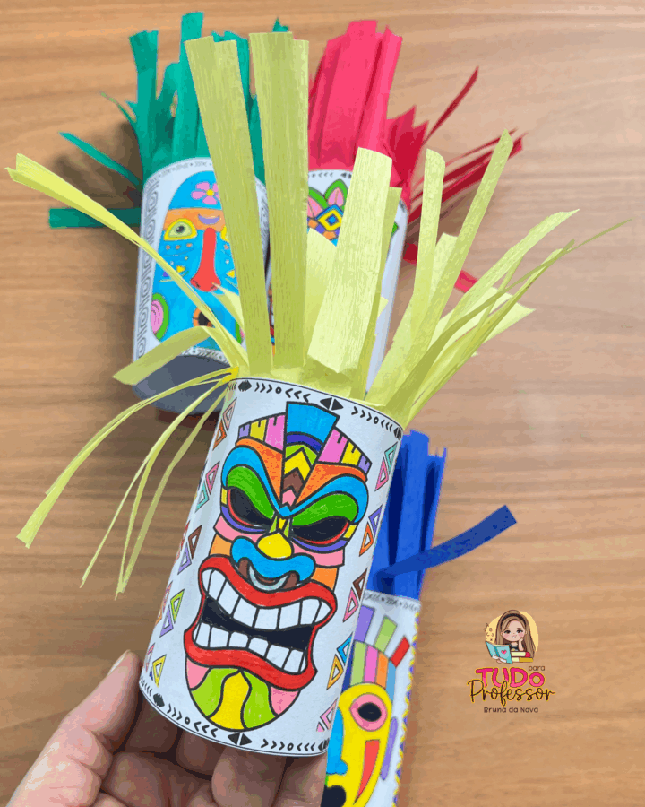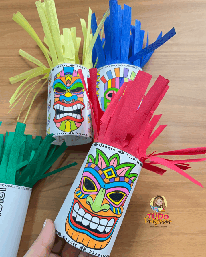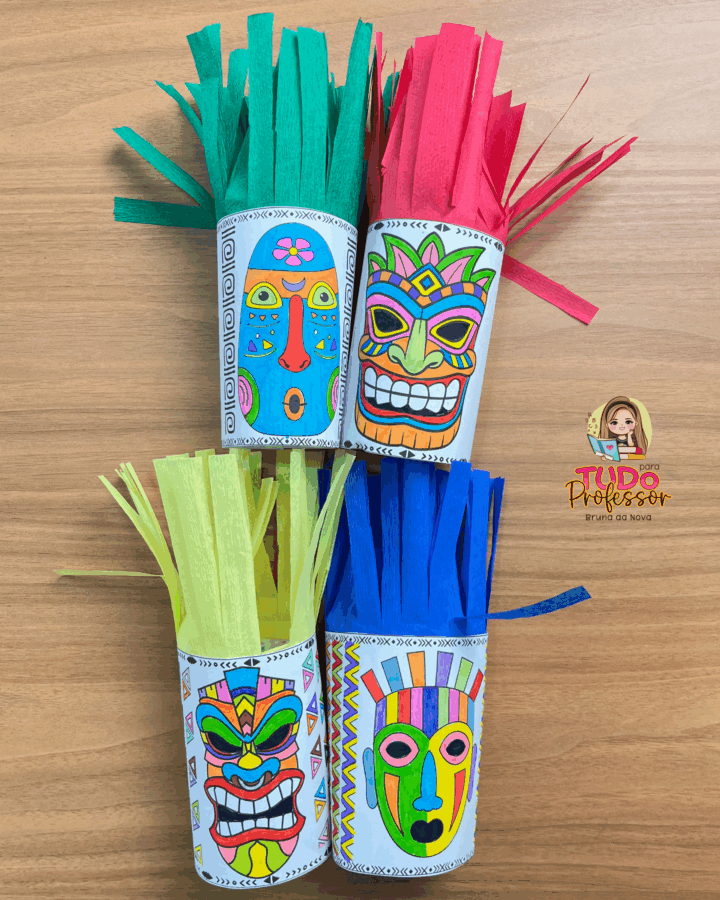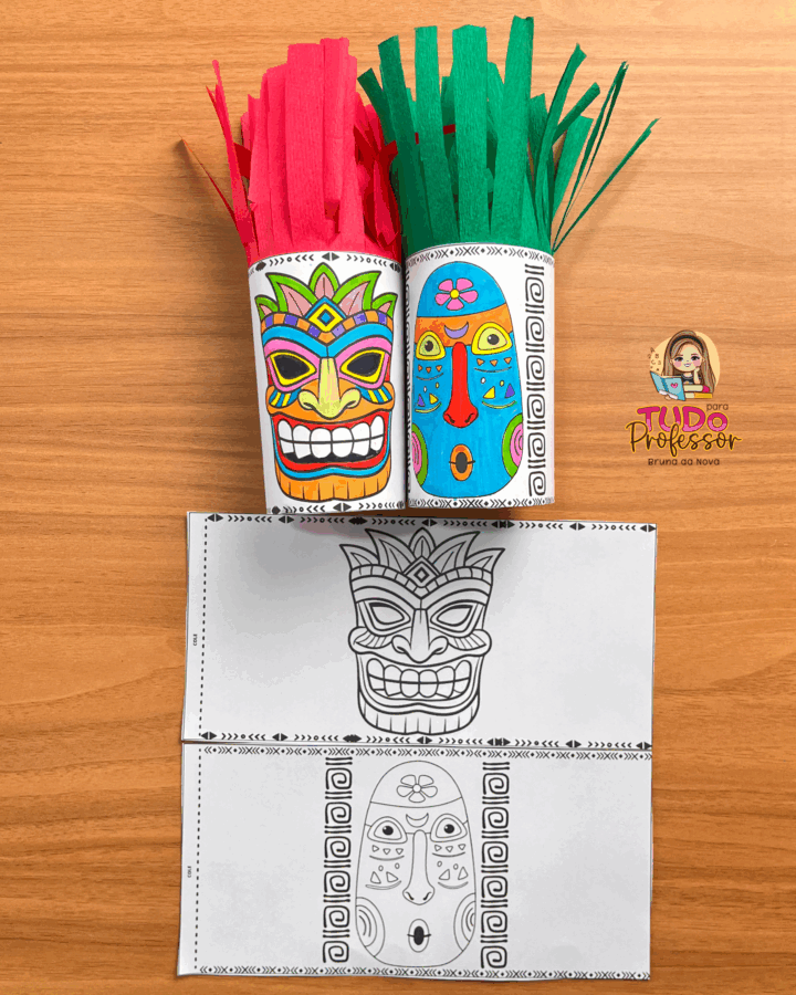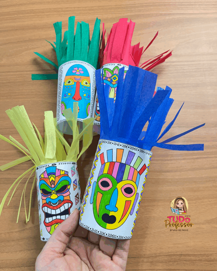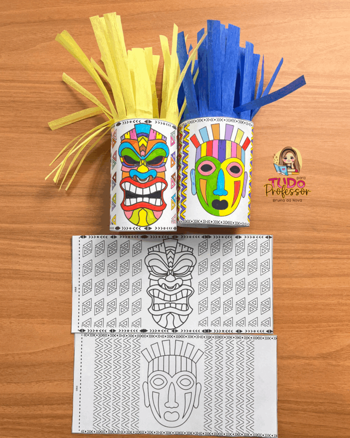 Máscaras africanas para colorir e montar em formato de rolinho, trabalhando identidade, arte e cultura afro-brasileira de forma divertida. Desenvolve criatividade, expressão artística e respeito à diversidade.