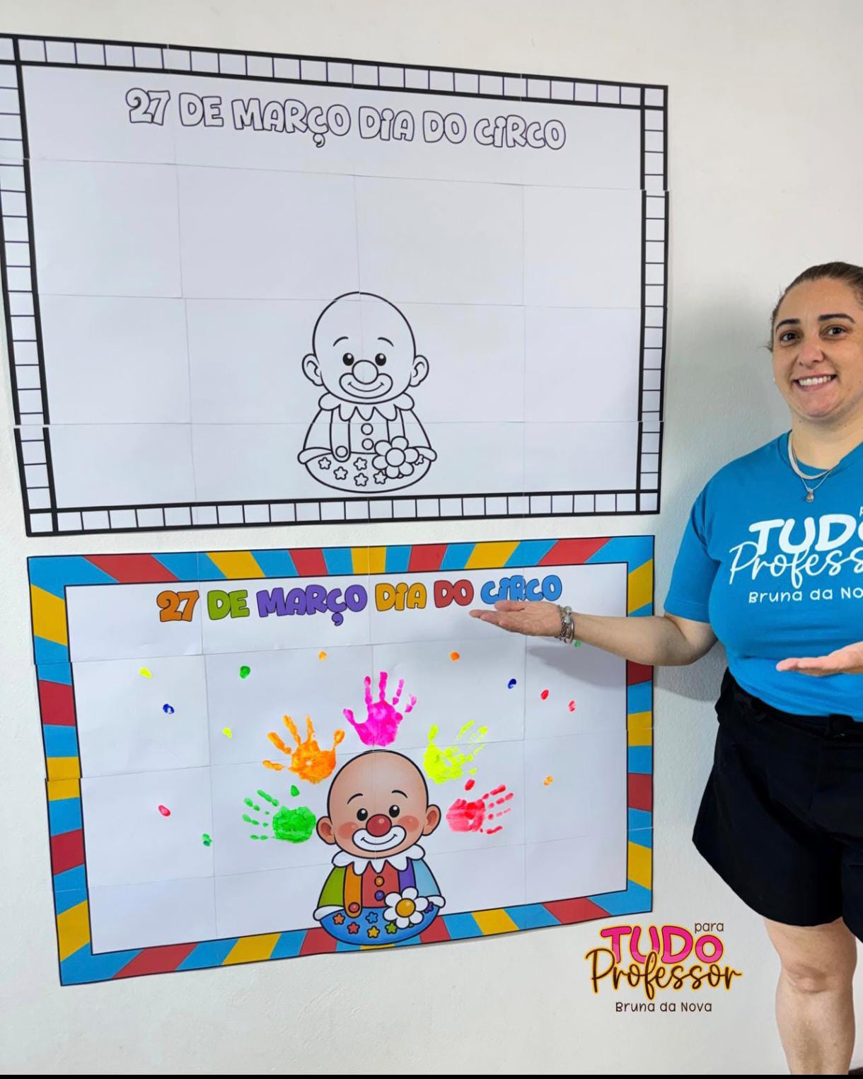 Transforme sua sala de aula em um verdadeiro espetáculo de alegria e imaginação com este painel temático do Dia do Circo – 27 de março! Desenvolvido com ilustrações infantis encantadoras e um palhacinho super simpático, esse material é perfeito para deixar o ambiente escolar lúdico, acolhedor e cheio de significado.