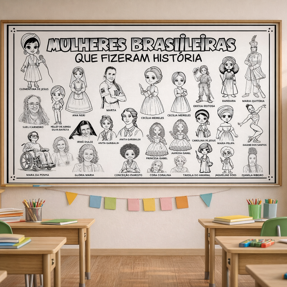 Um painel pedagógico para colorir que desenvolve consciência histórica, protagonismo feminino, valorização da cultura brasileira e aprendizado significativo.