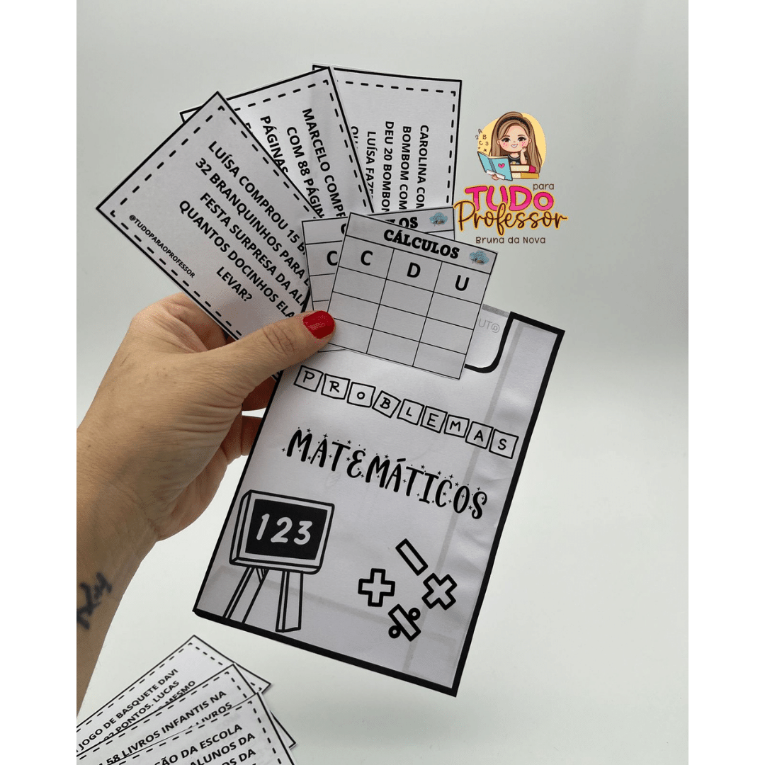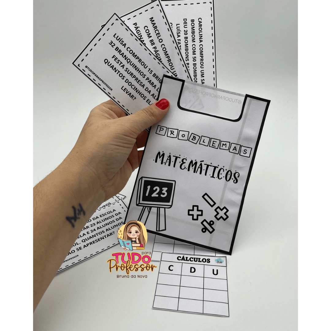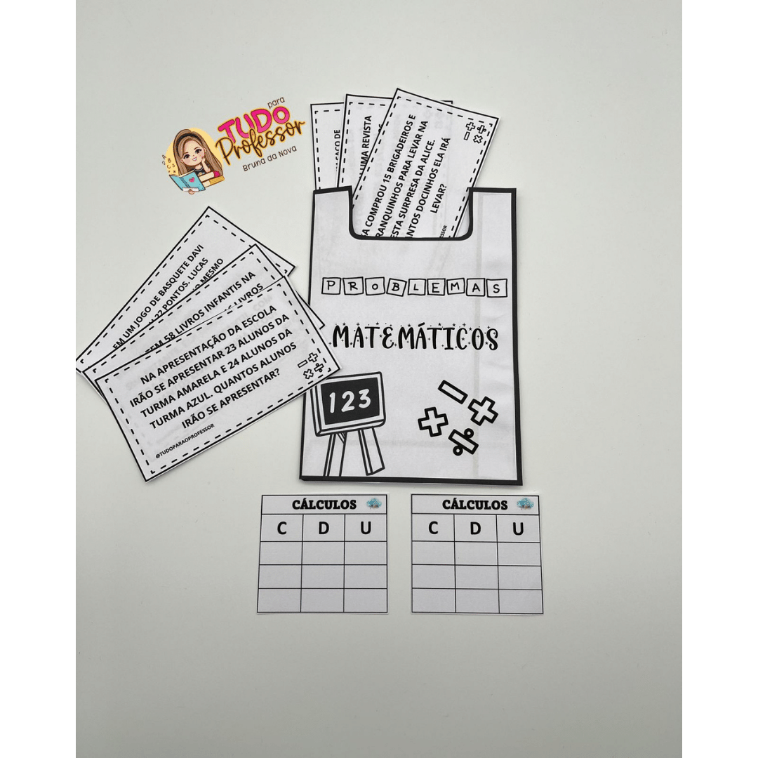 No envelope contém 18 problemas matemáticos no total incluindo adição e subtração, 18 fichas para a realização dos cálculos e a arte do envelope.
