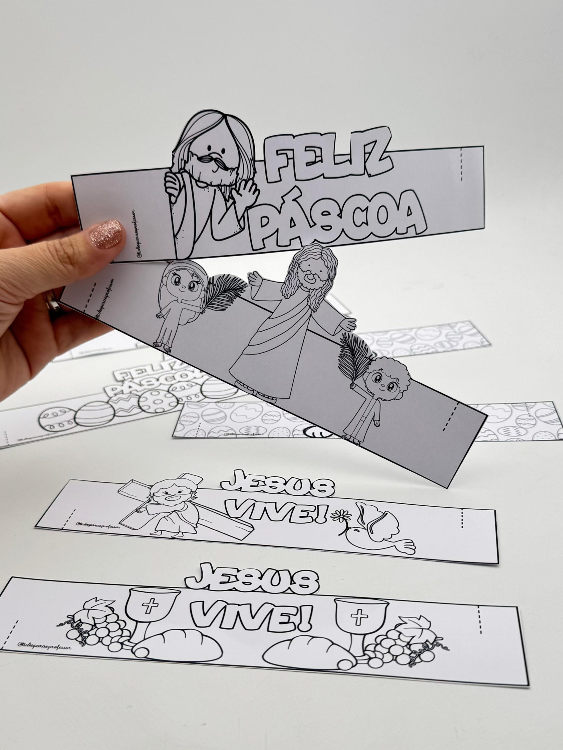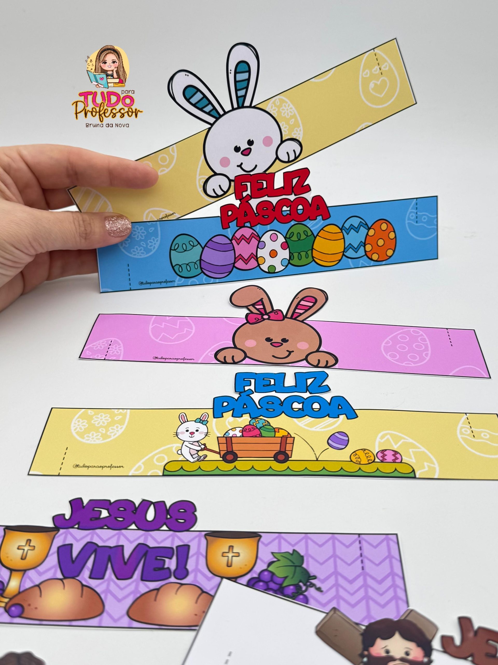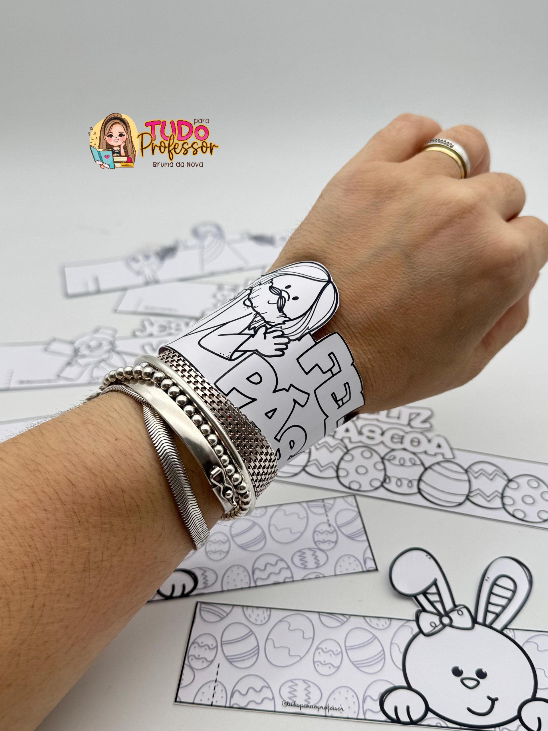 A elaboramos 8 modelos de pulseirinhas: 4 de coelho e 4 Cristã. Você irá imprimir somente a que desejar.